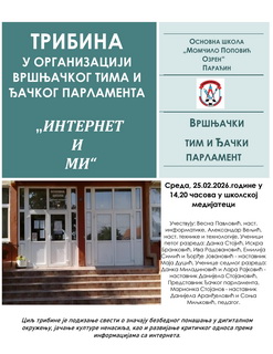 У организацији Вршњачког тима и Ђачког парламента биће одржана трибина под називом „Интернет и ми“, намењена члановима Вршњачког тима и представницима Ђачког парламента.