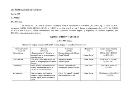 На основу чл. 126. став 1. Закона о основама система образовања и васпитања („Сл.гл.РС“, бр. 88/2017, 27/2018.-др.закони, 10/2019, 6/2020, 129/2021, 92/2023 и 19/2025) и чл. 34а. став 1. и став 7. Закона о уџбеницима („Сл.гл. РС“; бр. 27/2018, 92/2023 i 109/2025-даље Закон), Наставничко веће ОШ „Момчило Поповић Озрен“ у Параћину, на седници одржаној дана 24.3.2026.године, једногласно доноси